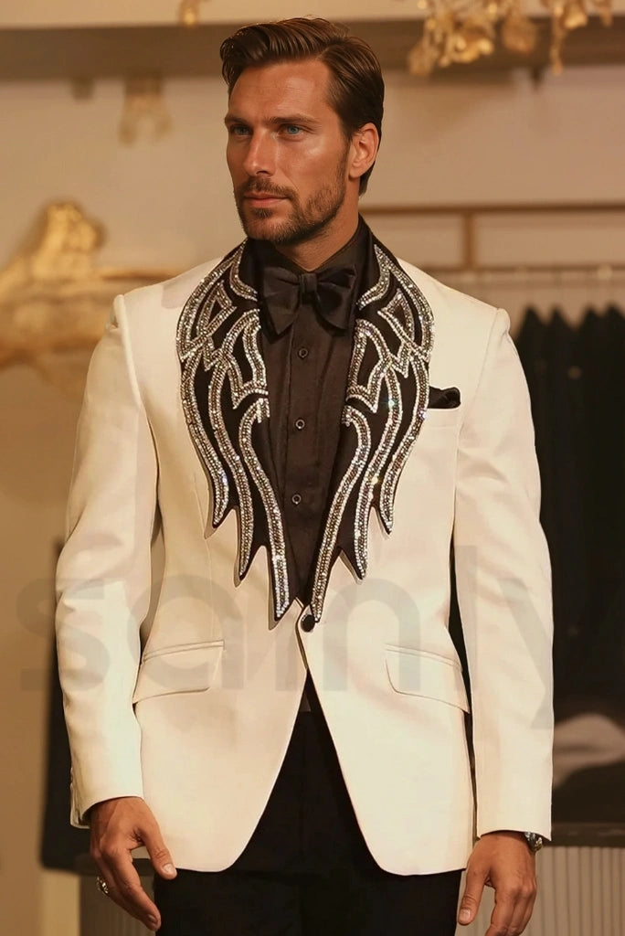 This is a two-piece embroidered suit designed for elegance and comfort. The off white blazer is tailored from high-quality important premium TR fabric, giving it a refined and classy look. It comes with black pants made from stretchable lycra fabric, which provide a comfortable fit. With its crystal-embroidered collar and stylish contrast design, this suit delivers a sophisticated appearance for any special occasion.