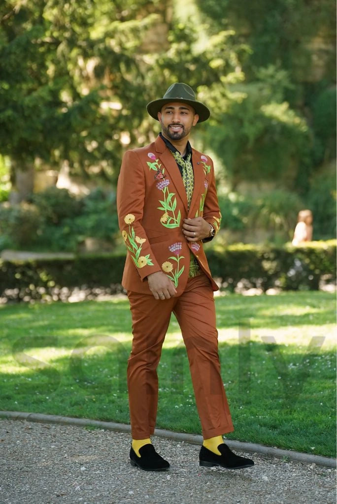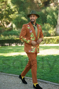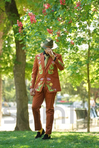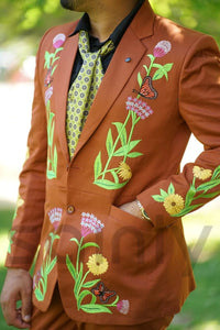 Embroidery Design:- This is a designer two piece rust suit for men. The blazer of this suit has beautiful and colorful embroidery of flowers, leaves and stems on both sides of the front and back. Some embroidered butterflies design has also been added to it. This design makes the embroidery very stylish and unique. The sleeves are also embroidered with yellow flowers and green leaves. This design has been prepared very precisely and carefully. This suit is designed for special occasions like weddings, engagement ceremonies, wedding cocktail parties or any other festive events.