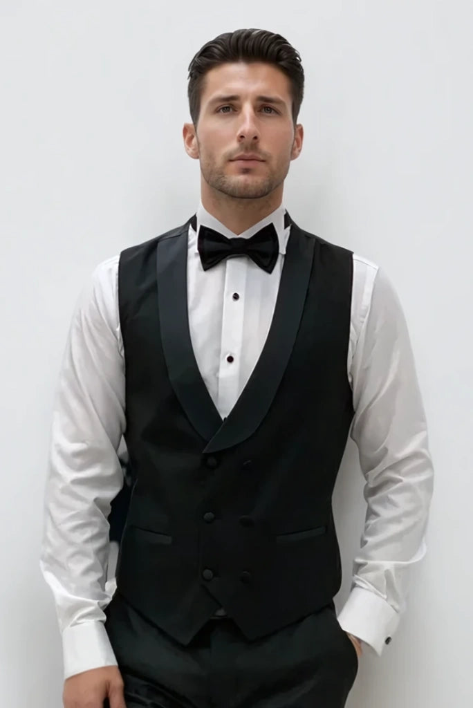 Vestcoat Features: This is a stylish double breasted vestcoat made from high quality fabric. It adjusts to the body contours beautifully and gives the wearer a smart and attractive look. The vestcoat has a black satin shawl lapel collar The vestcoat has six buttons made of fabric on the front The vestcoat has welt pockets on both the sides The double breasted design gives this vestcoat an elegant and professional look. It is ideal to wear on all occasions It fits according to the body contours and provides a slim smart look This vestcoat is designed for those who want a professional and stylish look.