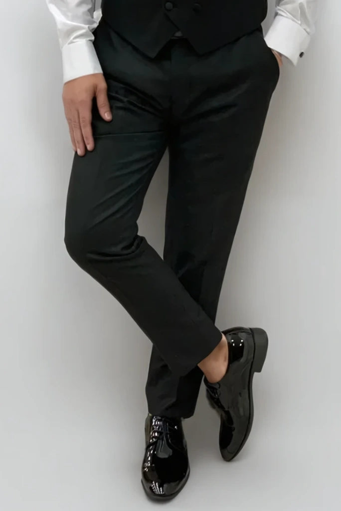 A stylish black tuxedo three piece suit for men crafted from imported premium blend TR which is comfortable breathable and durable too. This suit is made of high quality fabric which not only makes you look handsome and stylish but also provides an exclusive and sophisticated look. This black tuxedo suit is not only a perfect choice for special occasions like your wedding or reception but can also be worn for any ceremonies and events giving you a stylish and memorable look.