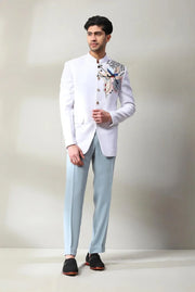 Men's White Bandhgala Embroidered Jodhpuri Blazer with Sky Blue Pant